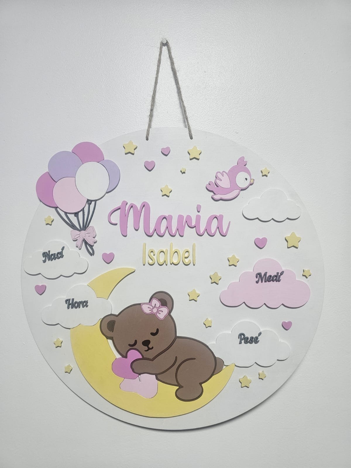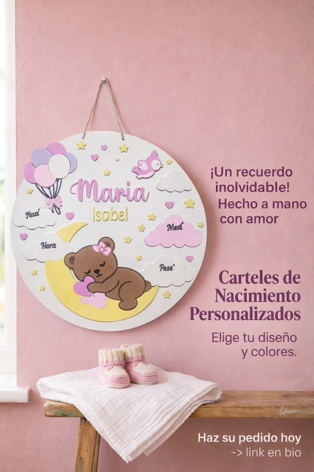 Celebra la llegada de tu bebé con un letrero único y especial. Personalízalo con el diseño o tema que más te guste. Tamaño de 40 cm de diámetro para destacar en cualquier espacio.
